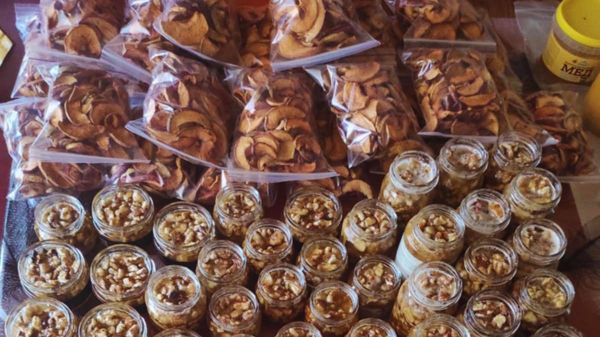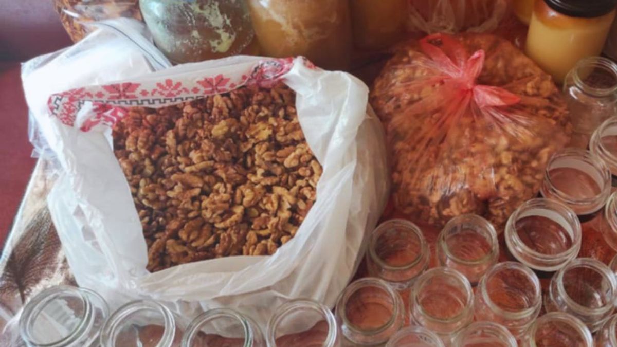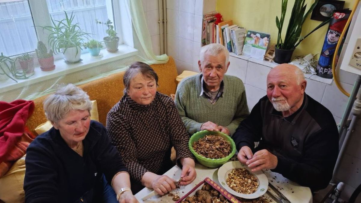 Горіхи колють мішками: Марія Баволяк, Василь Сипляк, Дана та Віктор Кучерявченки. Вони займаються цим уже давно, злагоджено та завзято. Після цього Алла Терентіївна та Валерій Андрійович Курасови підсмажують горіхи, а Світлана Романів і Тетяна Фурман розфасовують їх по баночках. Потім до горіхів додають мед — виходять смачні та поживні подарунки для наших Захисників.