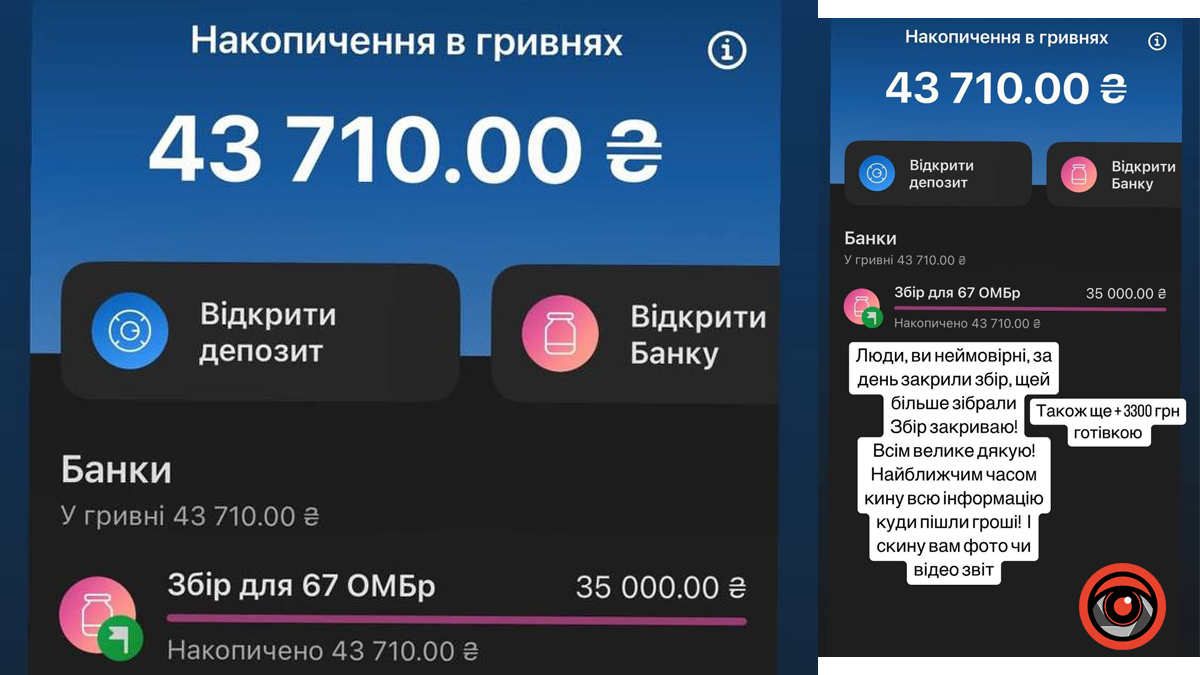 Загалом на сьогодні зібрано 43 710 грн. Також зроблено донати готівкою на суму 3 300 грн.