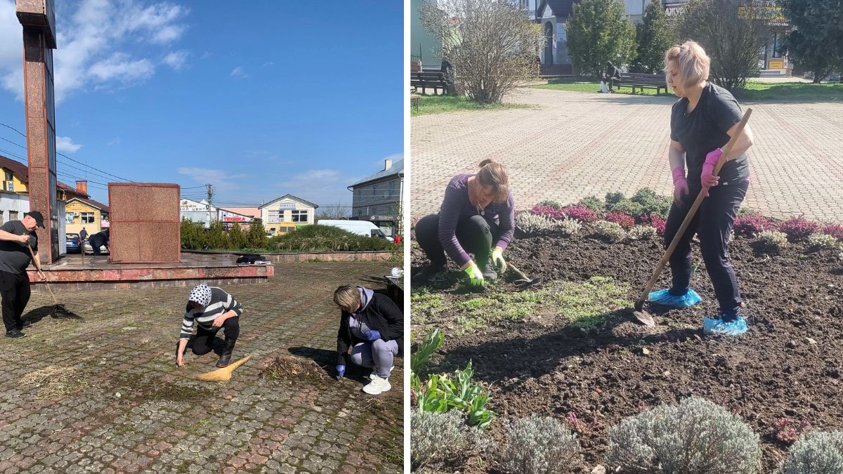 Так, у Рожнятові працівники селищної ради спільно зібралися і зробили благоустрій територій селища. Працівники відділів, організацій та установ почистили бруківку, прибрали місцевий парк та території біля пам’ятників визначним українським діячам, просапали клумби та висадили нові квіти.