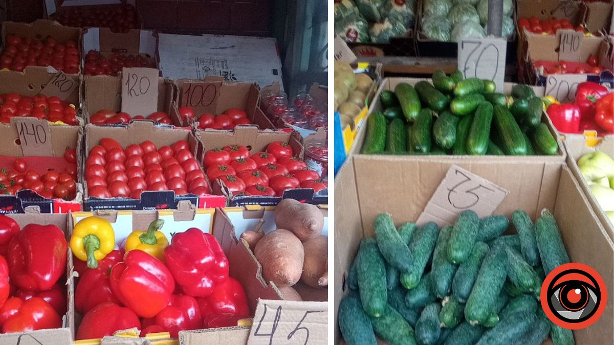 На ринку вул. Дзвонарська овочі найдешевші. Томати тут від 100 грн до 140 грн, різні сорти. Огірки також дешевші, як у магазинах – 70 грн та 75 грн за кілограм.