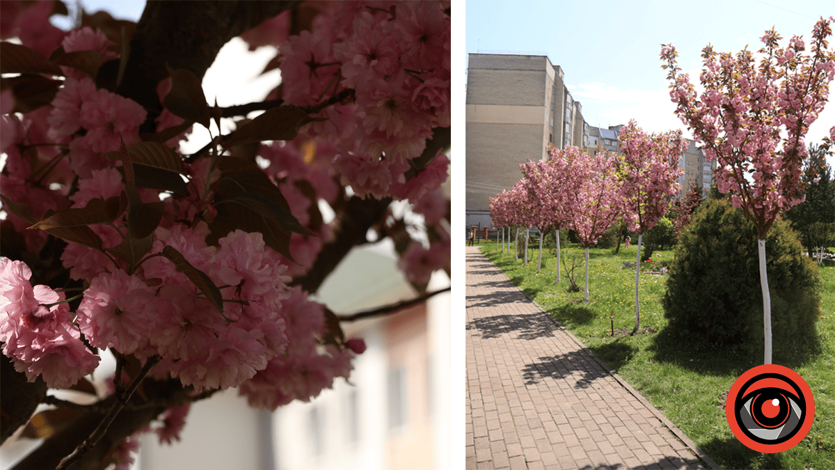 Гуляючи по центру міста, ми знайшли ще одні сакури, висаджені на території ліцею імені Дмитра Бахматюка. Саме тут люди найбільше фотографуються на фоні квітучих дерев. Навіть, щоб зробити декілька фото для репортажу, нам довелося просити людей на декілька секунд вийти із кадру:
