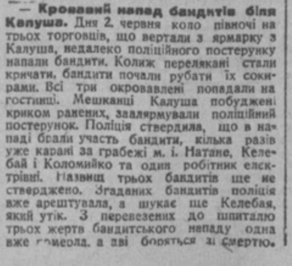 “Кровавий напад бандитів біля Калуша. Дня 2 червня коло півночі на трьох торговців, що вертали з ярмарку з Калуша, недалеко поліційного постерунку напали бандити. Колиж перелякані стали кричати, бандити почали рубати їх сокирами. Всі три окровавлені попадали на гостинці. Мешканці Калуша побуджені криком ранених, заалярмували поліційний постерунок. Поліція ствердила, що в нападі бгали участь бандити, кілька разів уже карані за грабежі м. і. Натане, Келебай і Коломийко та один робітник електрівні. Назвищ трьох бандитів ще не стверджено. Згаданих бандитів поліція вже арештувала, а шукає ше Келебая, який утік. З перевезених до шпиталю трьох жертв бандитського нападу одна вже померла. а дві боряться зі смертю”