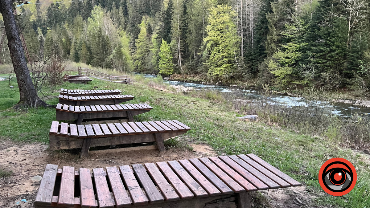 Здається, свого часу лісівники зробили все, щоб це місце стало комфортним для відпочинку гостей: подбали, щоб було де залишити авто, облаштували ігрову зону для дітей і відпочинковий простір для дорослих. Це чи не єдине на всю Калущину місце з пляжем, де на березі річки стоять не лише лавочки зі столами, а і 10 дерев’яних лежанок, на яких можна засмагати під сонечком або ж просто полежати чи навіть заночувати літньою порою.