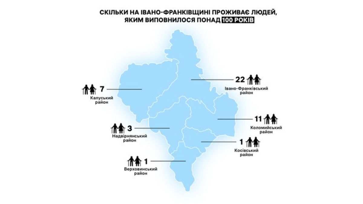 Таку інформацію надали представники громад у відповідях на інформаційні запити Суспільного. Найбільше довгожителів, які відзначили 100 і більше років, мешкає в Івано-Франківському районі — 22 людини: