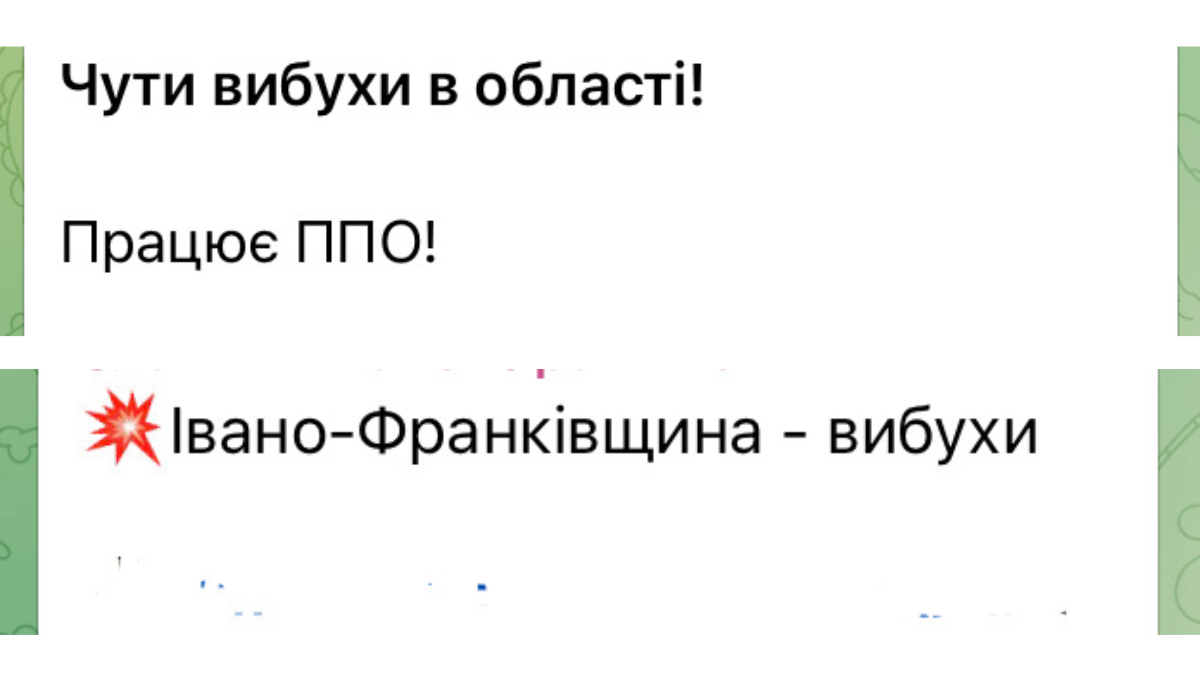 О 5:17 Повітряні Сили повідомляли про шахеди на Івано-Франківщині. Водночас низка Telegram-каналів сповіщали про звуки вибухів, що лунали на території області.