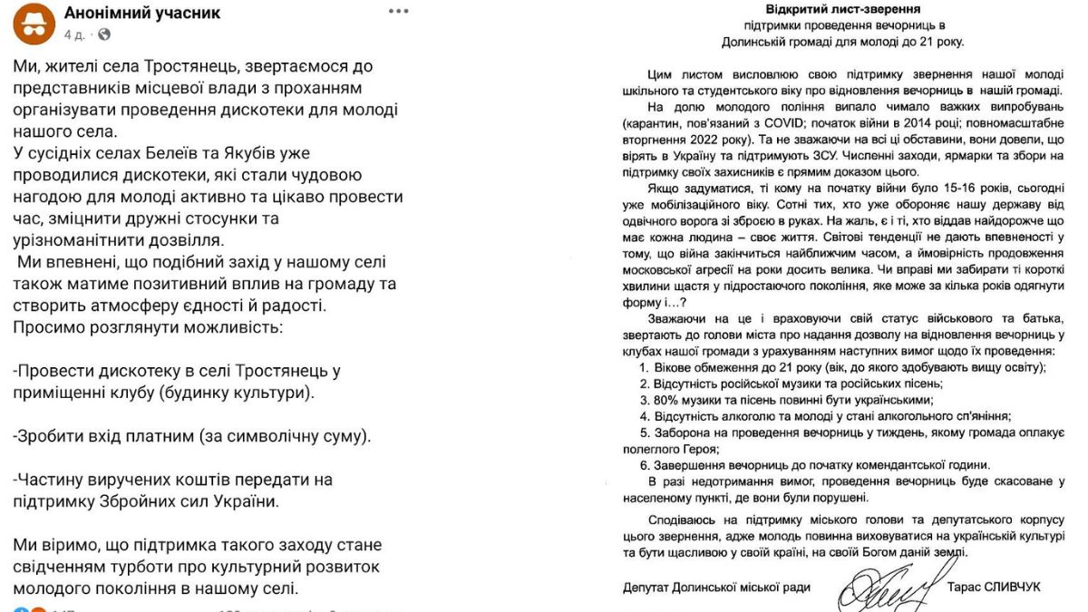 Нещодавно у соціальній мережі фейсбук у групі “Долина молода” був опублікований анонімний допис, де від імені жителів села Тростянець йде звернення-прохання до представників місцевої влади організувати проведення дискотеки для молоді їхнього села.