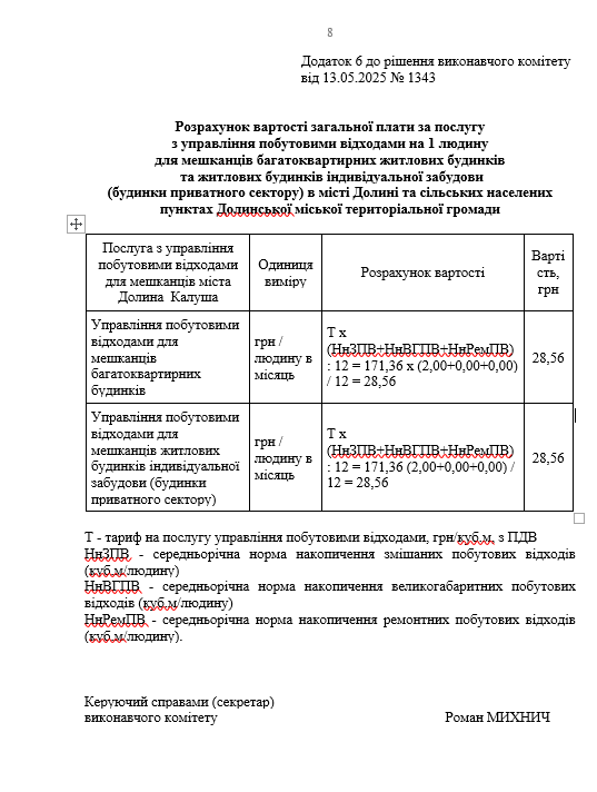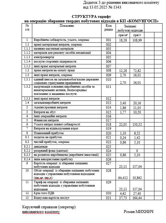 У додатках до рішення виконкому оприлюднена структура тарифу та розрахунок вартості на одну людину, інші дані: