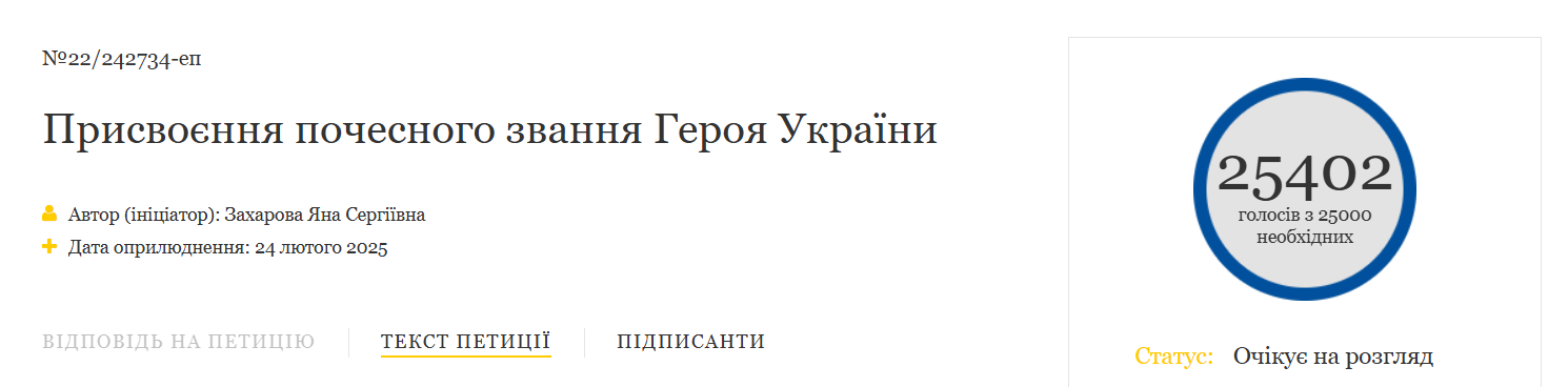 Декілька днів петиція про присвоєння звання Героя України калушанину Олександру Захарову не могла набрати необхідних 25 тисяч підписів. Втім в останній день вона все ж набрала більше 25 000 голосів. Тож тепер вона очікує на розгляд Президента України.