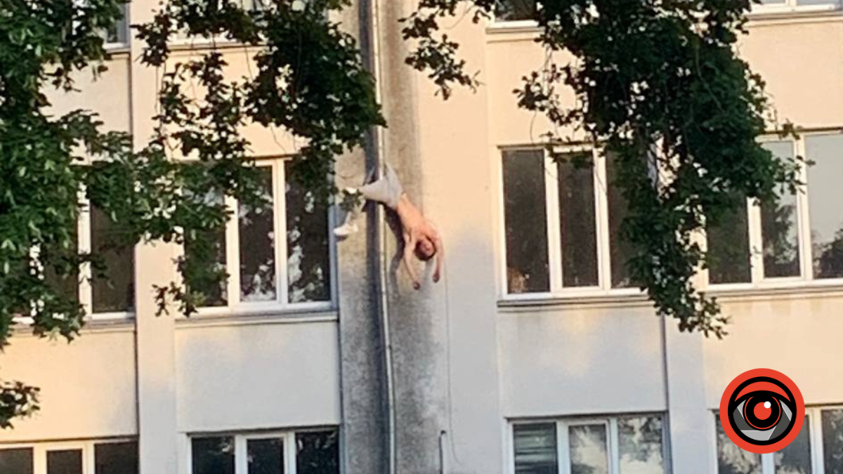 У Калуші чоловік без верхнього одягу ліз по стіні будинку, чіпляючись за водостічну трубу. На рівні приблизно третього поверху він звисав головою вниз.