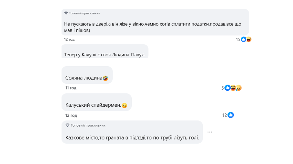 Калушани іронічно писали, що його не пускали через двері, тож він вирішив лізти у вікно, щоб все ж сплатити податки. Дехто охрестив його калуським “спайдерменом”: