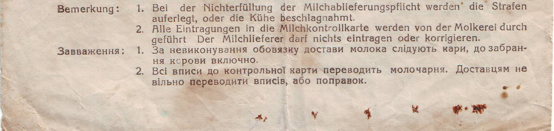 “1. За невиконування обовязку достави молока слідують кари, до забрання корови включно. 2. Всі вписи до контрольної карти переводить молочарня. Доставцям не вільно переводити вписів або поправок”, — йдеться у документі