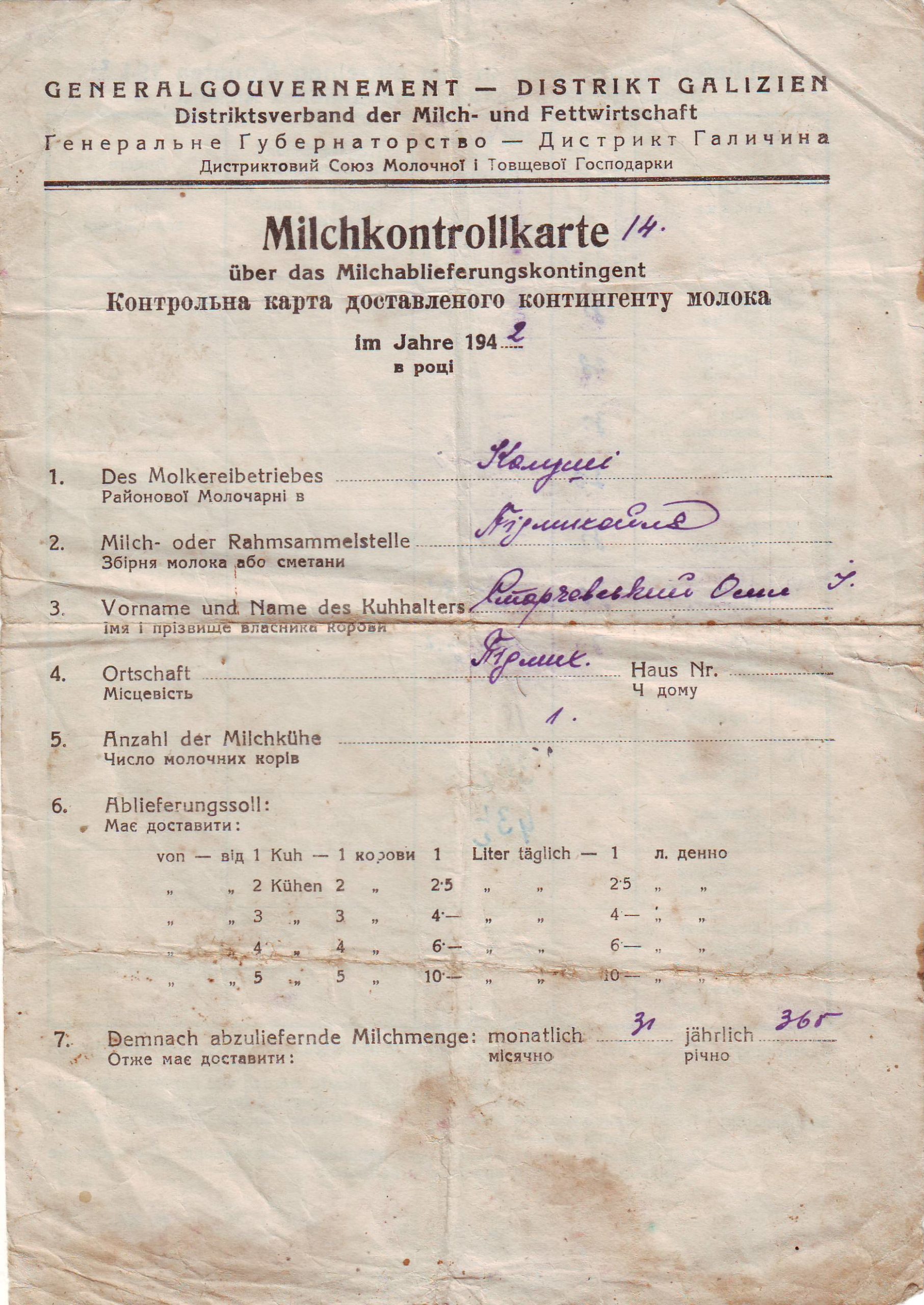 Без сумніву історичний документ був виданий на ім’я Олеся Старчевського, який володів однією коровою. Він стосується збірні молока та сметани, що розміщувалася у Підмихайлі. В свою чергу вона підпорядковувалася районній молочарні у Калуші. Німці вимагали від селян, щоб ті здавали у певній кількості харчі для потреб військових. Власне на цій картці зазначено, що господар щоденно повинен здати до районної молочарні по 1 літру молока.