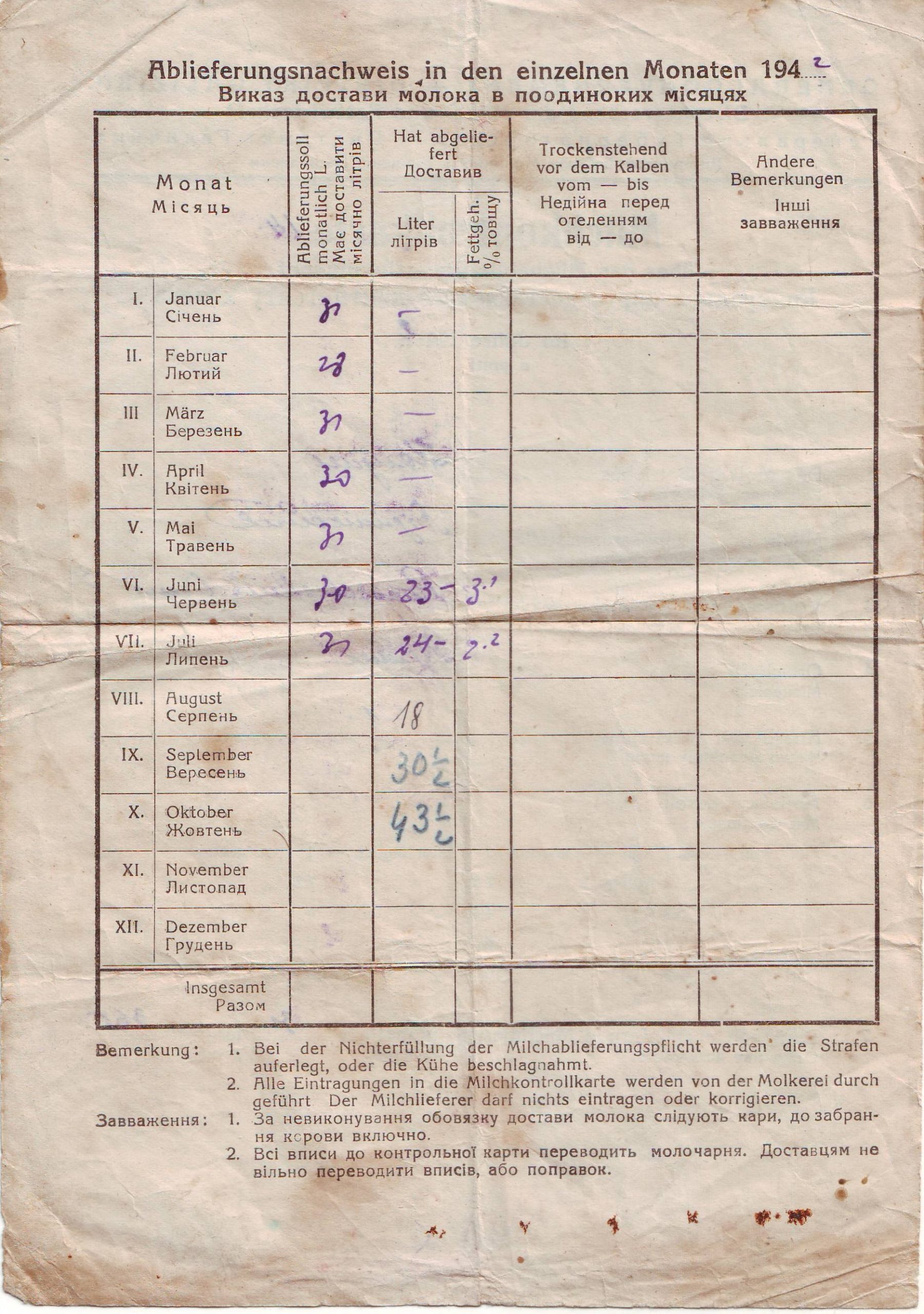 Відповідно за цілий рік цих літрів повинно було набігти 365 літрів. На звороті бачимо “виказ достави молока в поодиноких місяцях”, де вказувалася кількість зданого молока щомісячно.