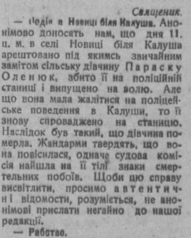 “Священик. Подія в Новиці біля Калуша. Анонімово доносять нам, що дня 11. ц. м. в селі Новиці біля Калуша арештовано під якимсь звичайним замітом сільську дівчину Параску Оленюк, збито її на поліційній станиці і випущено на волю. Але що вона мала жалітися на поліцейське поведення в Калуши, то її знову спроваджено на станицю. Наслідок був такий, що дівчина померла. Жандарми твердять, що вона повісилася, одначе судова комісія найшла на її тілі знаки смертельних побоїв. Щоби цю справу висвітлити, просимо автентичні відомости, розуміється, не анонімові прислати негайно до нашої редакції. Рабство.”