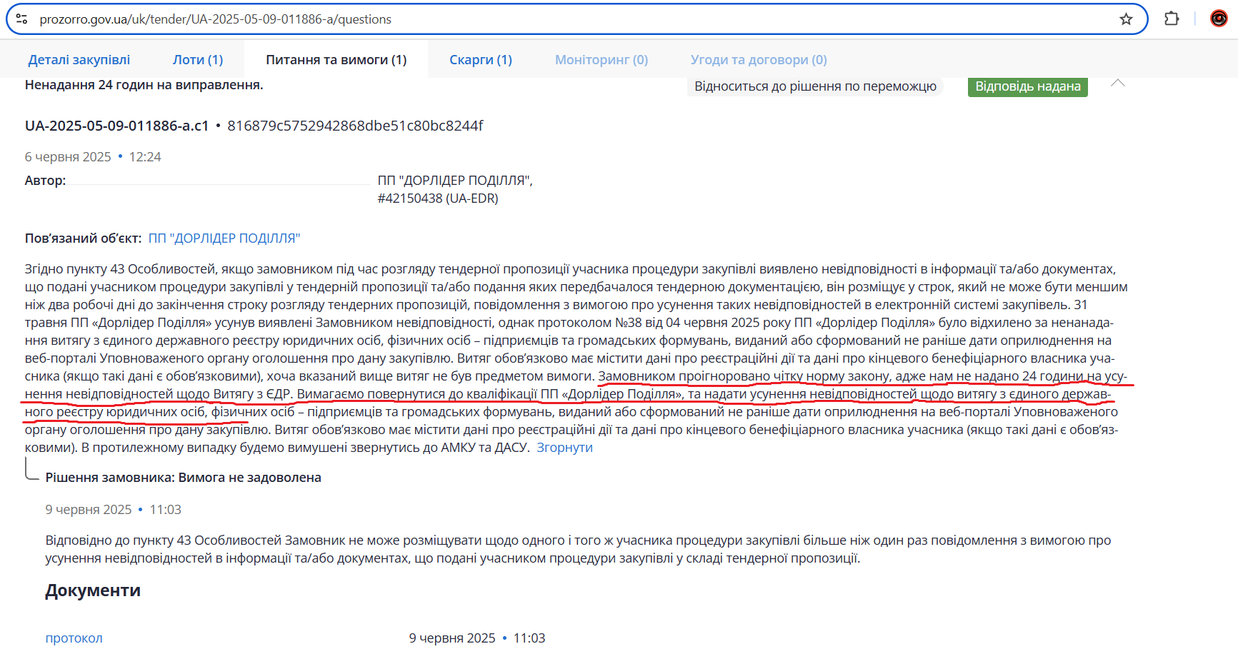 Проте, ПП “Дорлідер Поділля” оскаржує рішення Управління благоустрою та інфраструктури Долинської міської ради, яке є замовником закупівлі. Зокрема, цей учасник вказує на те, що йому не був наданий, передбачений законодавством час на виправлення невідповідностей.