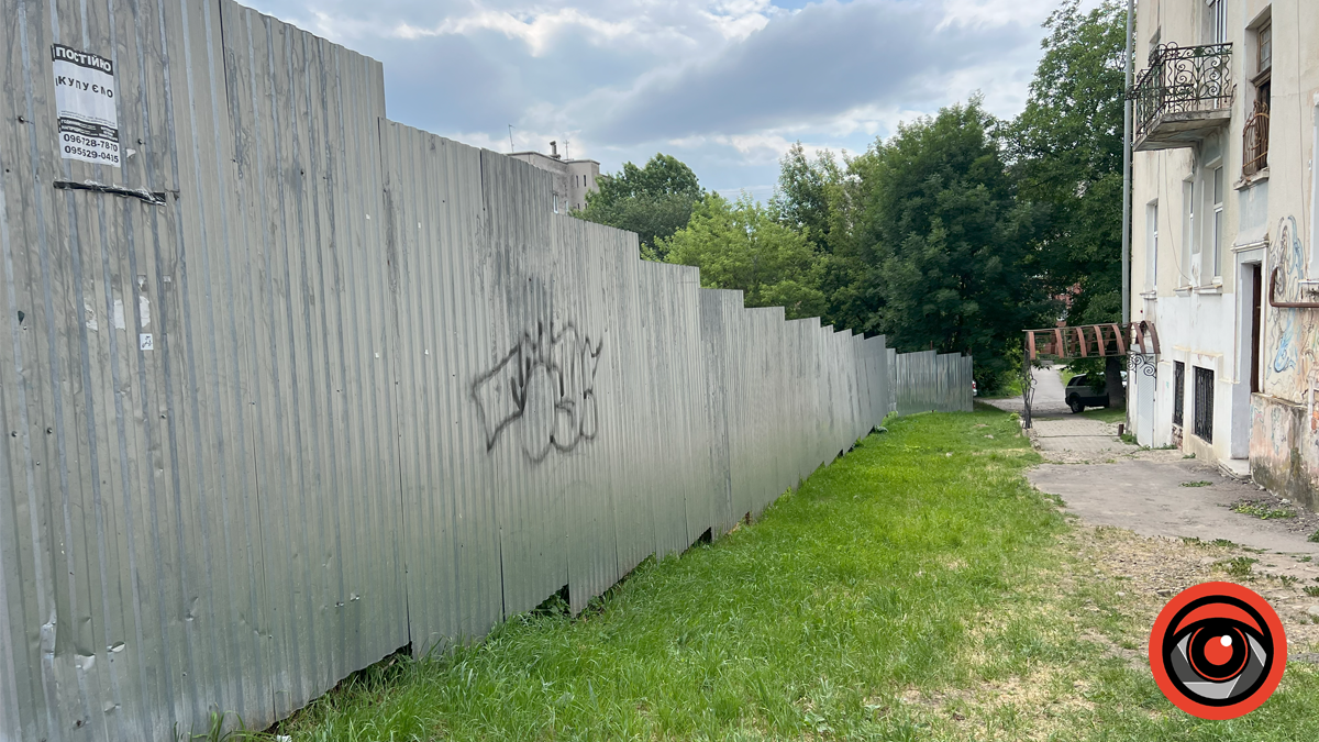 У самісінькому центра навпроти “Галичанки теж видніється парканець, але тут будівництво наразі не ведеться. Якщо глянути ззаду, то там проста зелена зона за огородженням. Тут він десь трішки похилився, десь дещо пошарпаний, але в цілому стоїть міцно. Особливістю є те, що він обмальований різними написами.