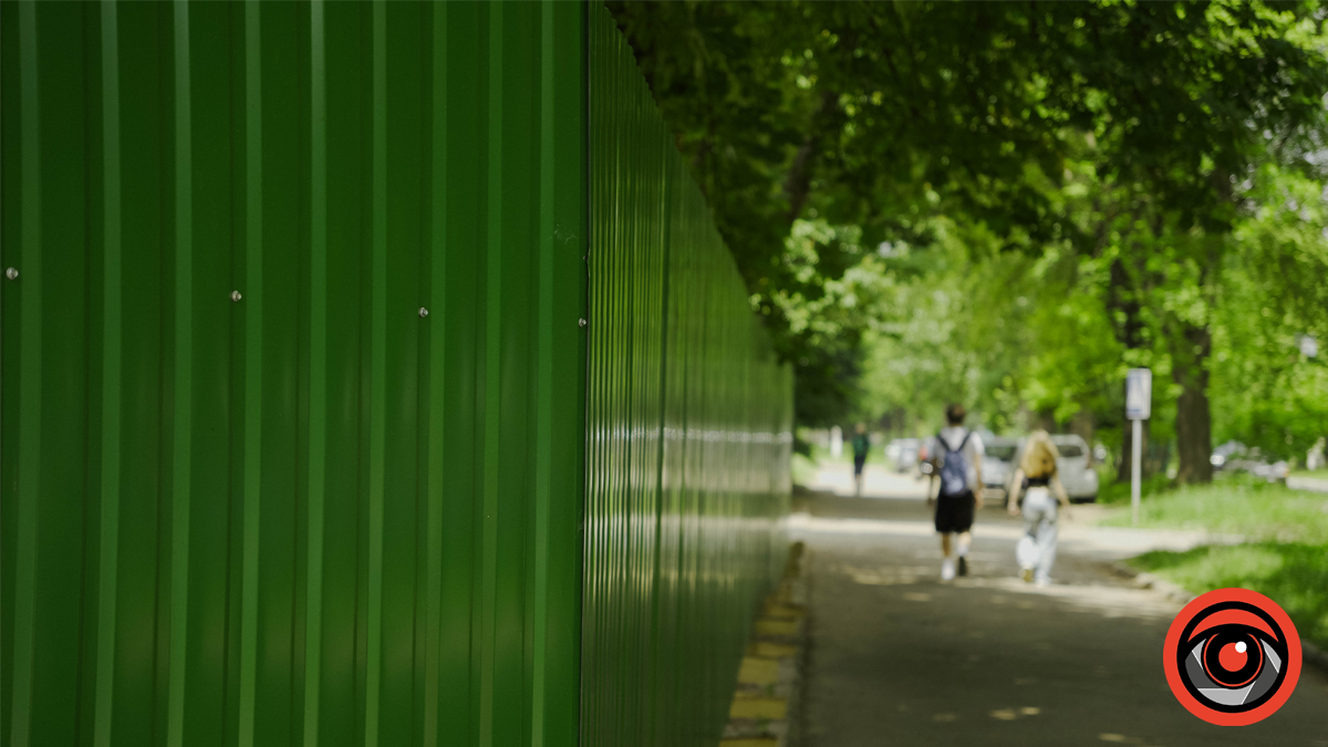 Візуально металевий паркан виглядає добре закріпленим і рівним. Однак, окремі листи на межі стику тут загнулися та почати ржавіти. Якщо ризику падіння загорожі начебто немає, то проходячи близько до паркану не виключено, що можна ненароком покалічитися.