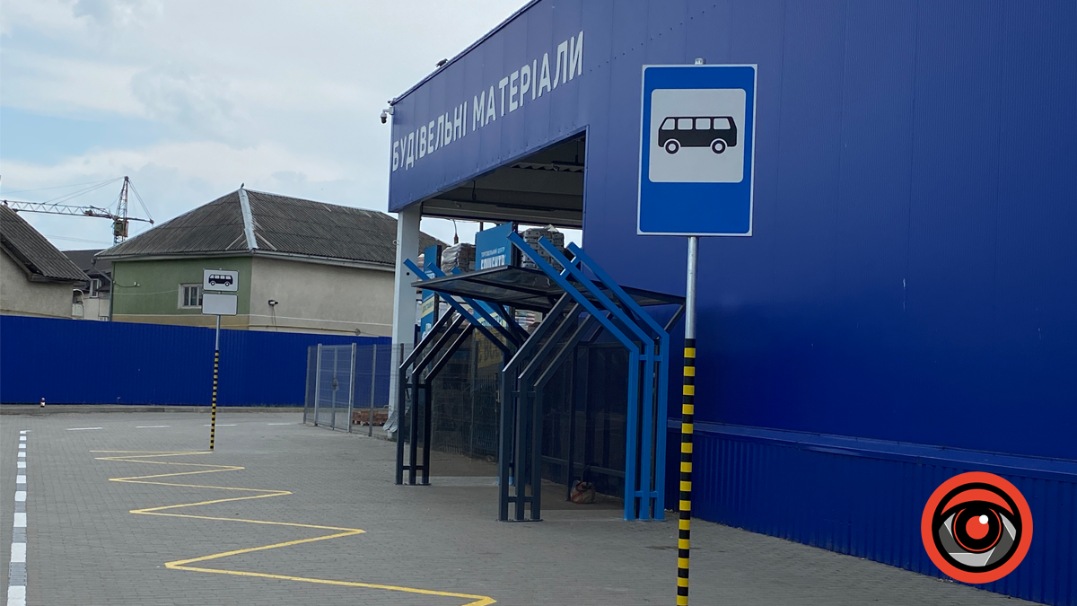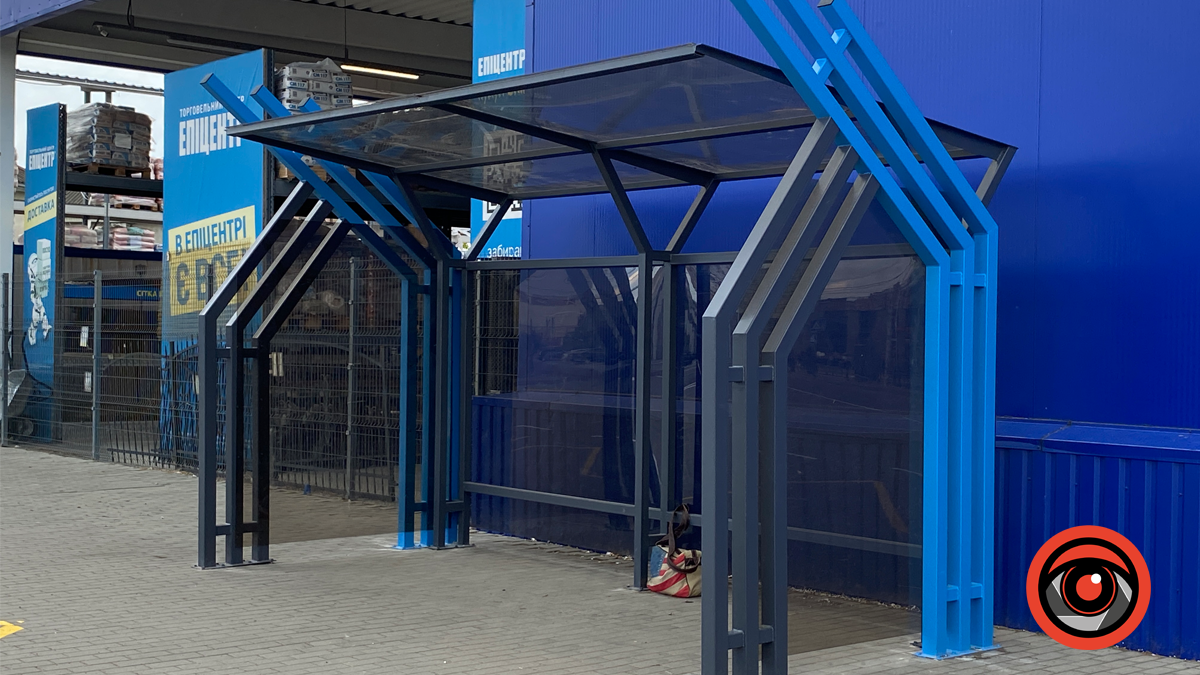 Нову зупинку вже встановили впритул до зовнішньої стіни торговельного центру. Виглядає вона завершеною, бракує хіба що ще лавочок. Облаштовує зупинку місто, а не магазин.