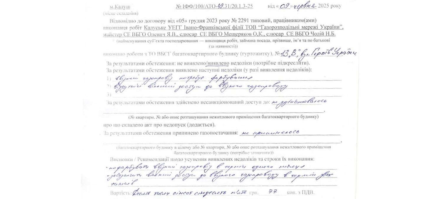У зазначеному в калуській групі дописі було вказано, що платіжка прийшла за адресою будинку по вул. Героїв України, 13 В. На сайті газовиків є акт про виконані роботи за цією адресою. Відомо, що проводилися відповідні технічні роботи 9 червня 2025 року й під час робіт було виявлено недоліки: відсутній вільний доступ до ввідного газопроводу і він потребував фарбування. Відповідно до висновків, було рекомендовано протягом одного місяця усунути перелічені вище недоліки.