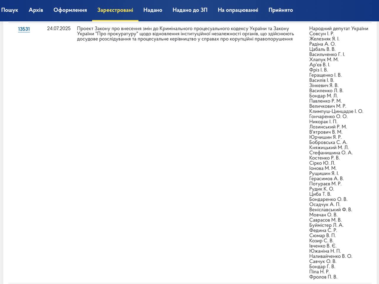 24 липня у Верховній Раді України зареєстровано новий законопроєкт №13531 “Про внесення змін до Кримінального процесуального кодексу України та Закону України “Про прокуратуру” щодо відновлення інституційної незалежності органів, що здійснюють досудове розслідування та процесуальне керівництво у справах про корупційні правопорушення”.