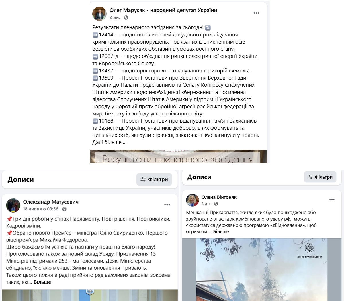 Інший представник Калущини Олександр Матусевич – теж нічого після голосування не публікував, а крайній допис на сторінці датується ще 18 липня. У ньому йдеться про результати трьох днів роботи у парламенті.