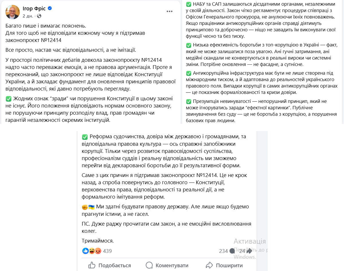 Одним із тих, хто активно писав та пояснював свою позицію майже одразу після прийняття закону був Ігор Фріс з Івано-Франківська. Зокрема, депутат написав, що часто у просторі політичних дебатів “перемагає емоція, а не правова аргументація”. Він є переконаним, що законопроєкт №12414 відповідає нормам Конституції: