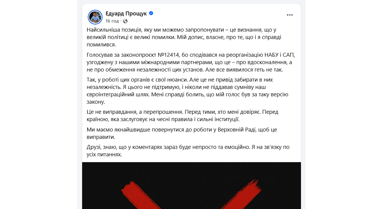 Народний депутат України від Калуського виборчого округу №85 Едуард Прощук на своїй сторінці виклав допис, де зізнався, що вчинив помилку, адже у “великій політиці є великі помилки”: