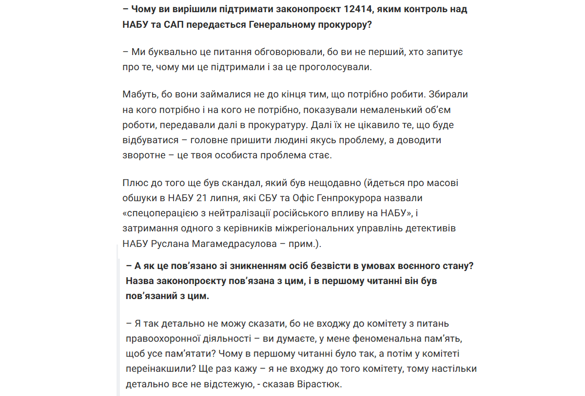 Плюс до того ще був скандал, який був нещодавно (йдеться про масові обшуки в НАБУ 21 липня, які СБУ та Офіс Генпрокурора назвали “спецоперацією з нейтралізації російського впливу на НАБУ”, і затримання одного з керівників міжрегіональних управлінь детективів НАБУ Руслана Магамедрасулова – прим.).”, — пояснив Василь Вірастюк