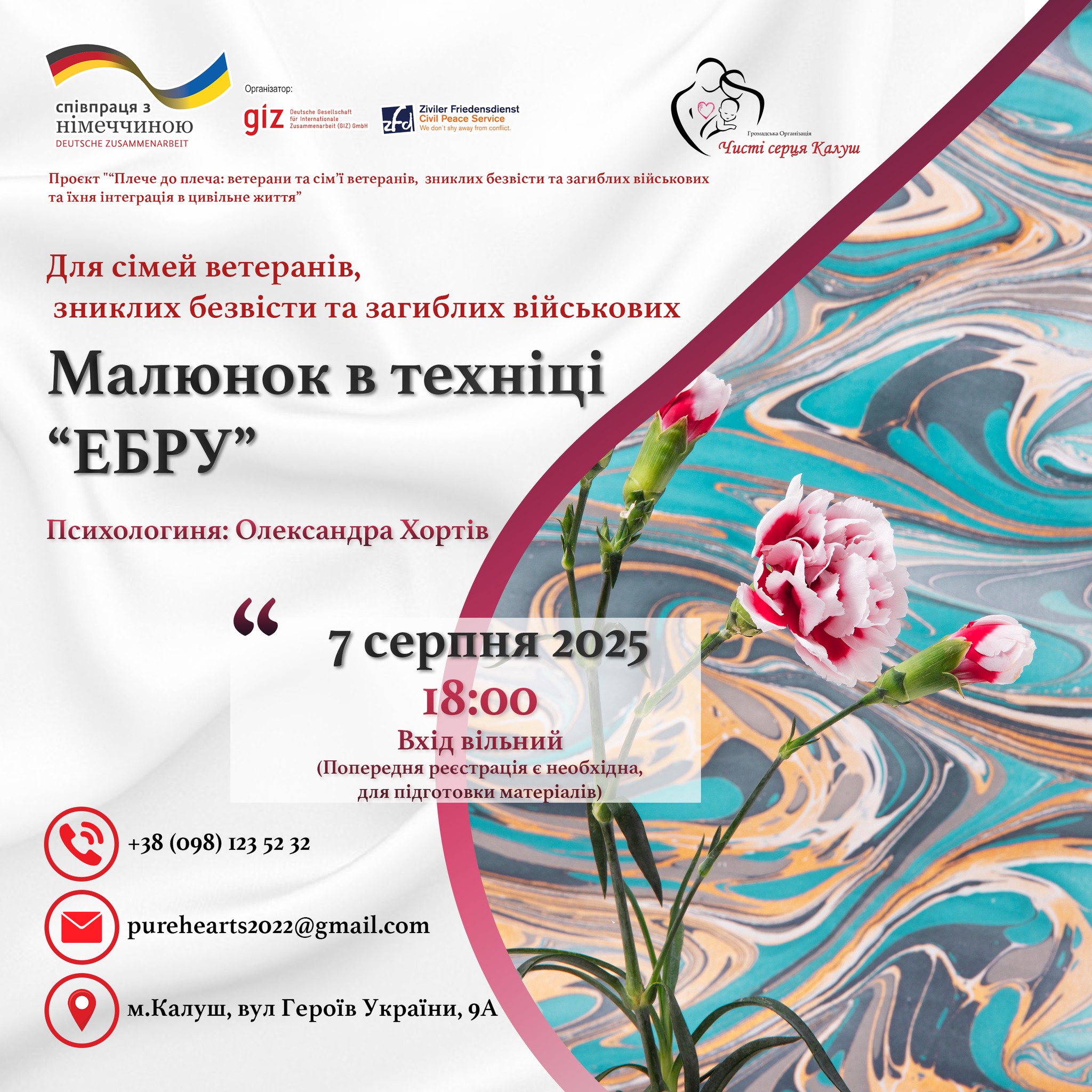 Малюнок в техніці “ЕБРУ” будуть створювати 7 серпня. До участі запрошують сім’ї ветеранів, зниклих безвісти та загиблих військових. Заняття проводитиме психологиня Олександра Хортів. Початок — о 18:00 на базі простору ГО “Чисті серця Калуш” (вул. Героїв України, 9А).
