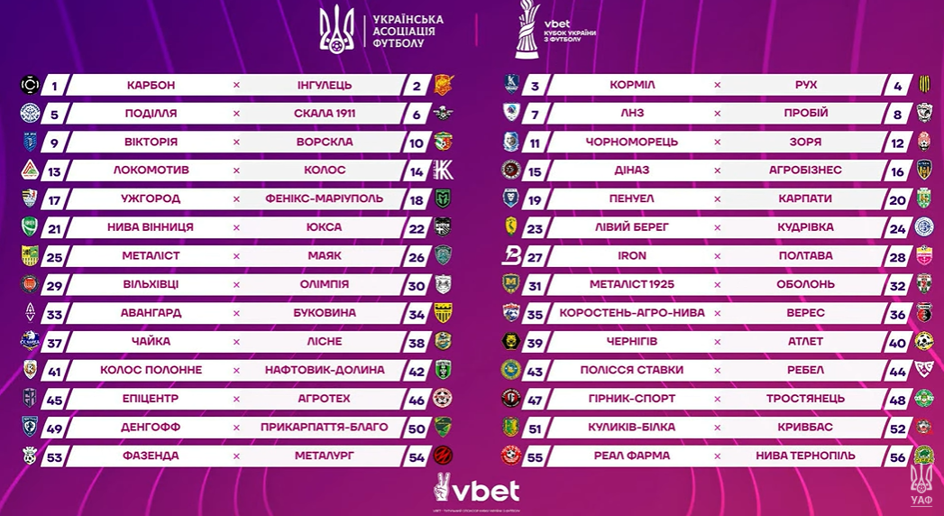 Слід сказати, що на етапі 1/32 фіналу Кубка України з футболу до 8 переможців попереднього етапу долучаться 31 клуб ПФЛ (клуби Першої та Другої Ліг), а також 5 команди-представники Асоціації аматорського футболу України та 12 команд Української Прем’єр-Ліги.