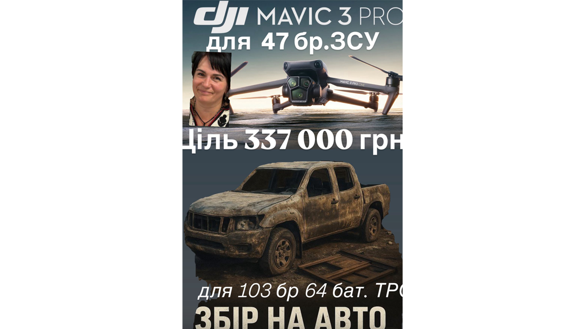 Воїнам 47 окремої механізованої бригади “Магура” для виконання бойових завдань необхідно придбати дрон Mavic 3 Pro. Також військовослужбовці 64 батальйону 113 бригади ТрО потребують автівки. Загальна ціль збору – 337 тис. гривень. Ви також можете долучитися до збору своїм донатом: