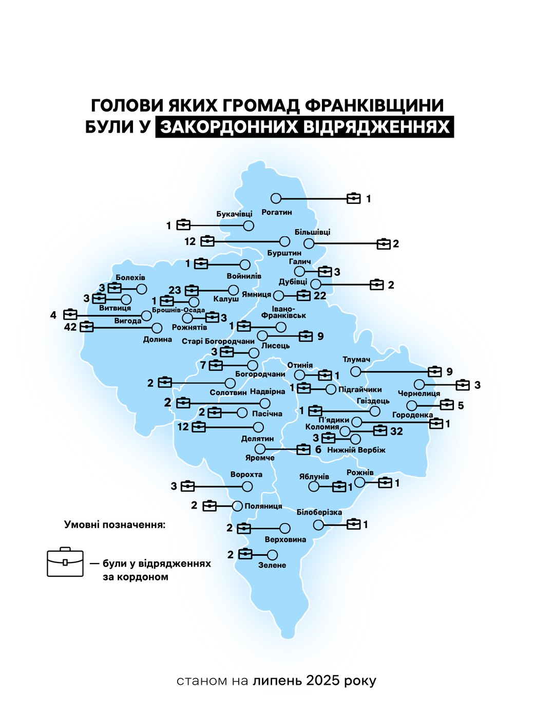 Скільки разів голови громад Івано-Франківщини були у закордонних відрядженнях за період з 2022 по 2025 роки. Інфографіка Суспільного