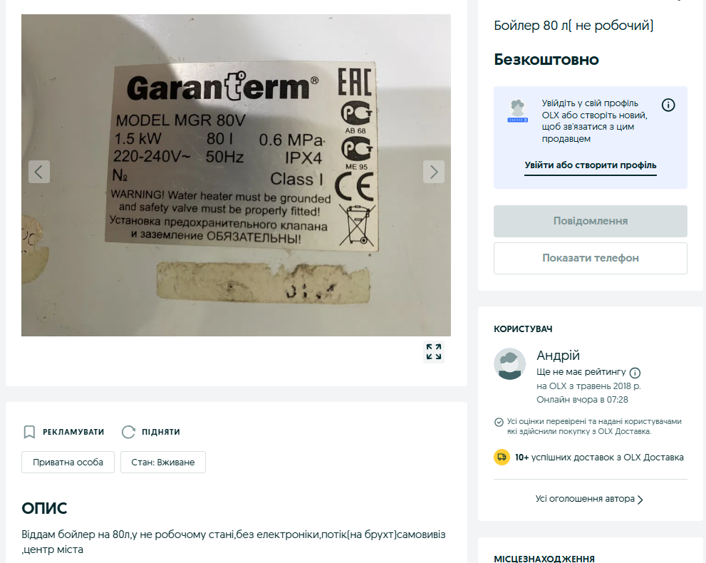 Як не дивно, але у Калуші безкоштовно віддають бойлер. Але є одне але: він не робочий. Він без електроніки, а ще він потік, тому як пише у описі калушанин, він піде на брухт.