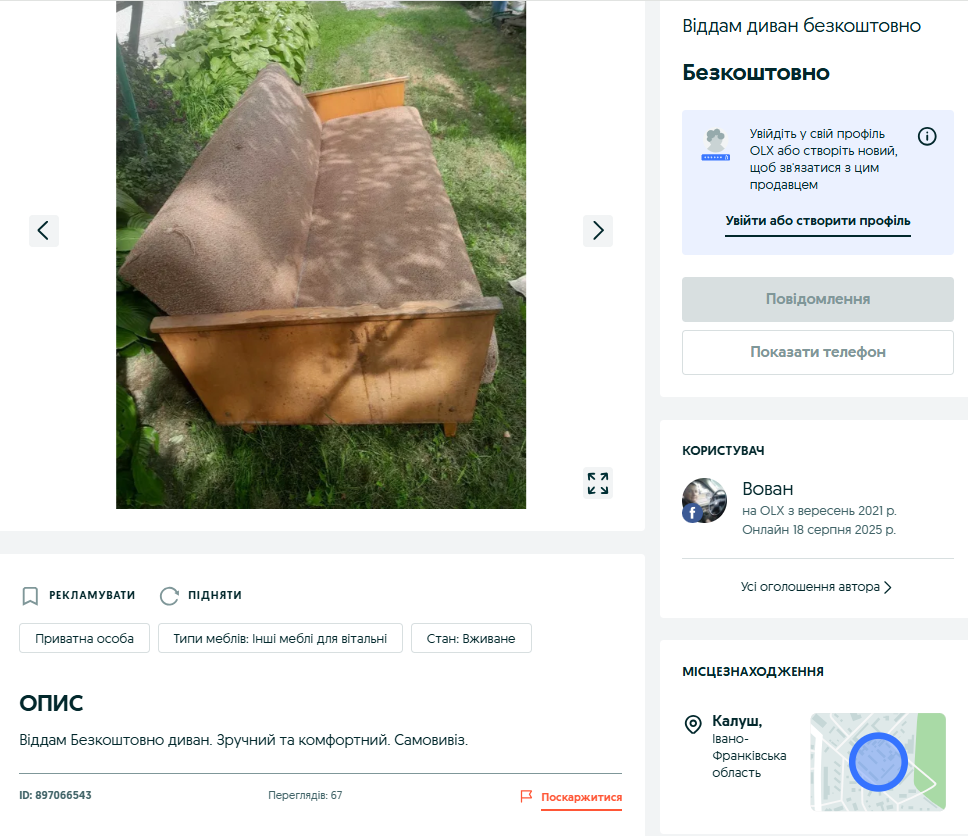 У Калуші знову задарма віддають диван. Власники кажуть, що він зручний, але причини такого кроку не називають. Додають, що віддадуть тому, хто приїде і самотужки забере його.