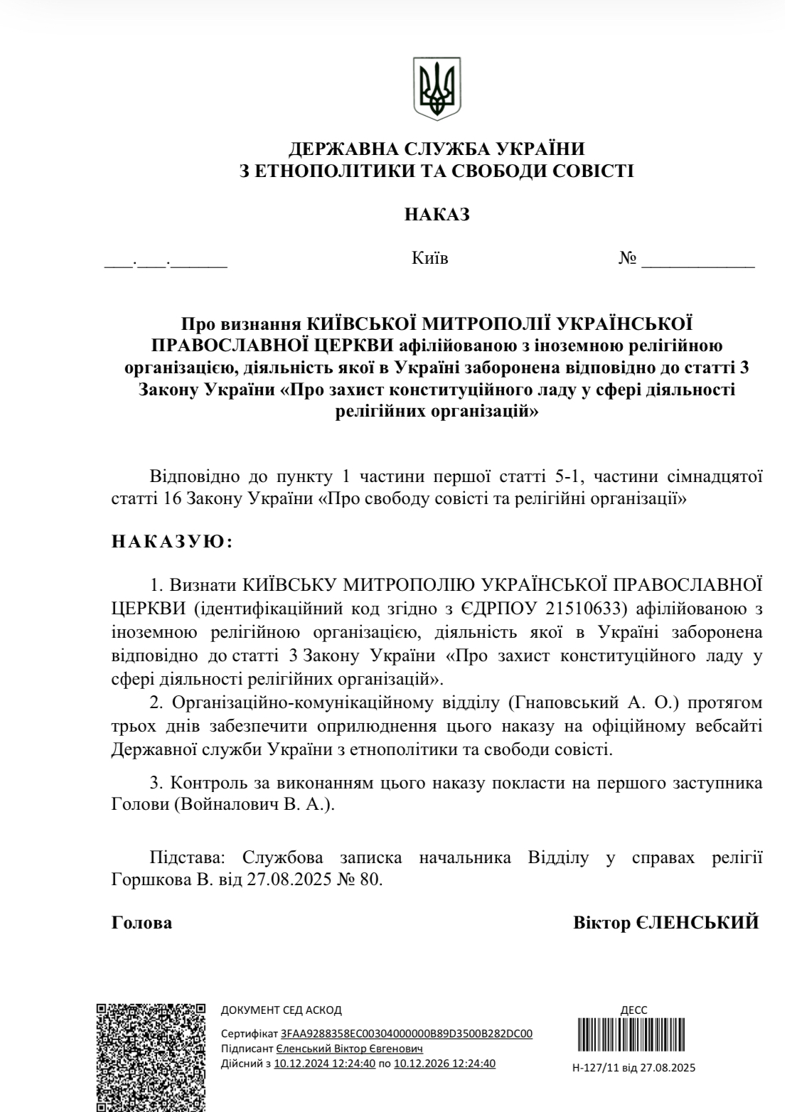 27 серпня 2025 відповідний наказ про визнання УПЦ МП афілійованою з іноземною релігійною організацією, діяльність якої заборонено в Україні видала Державна служба України з етнополітики та свободи совісті.