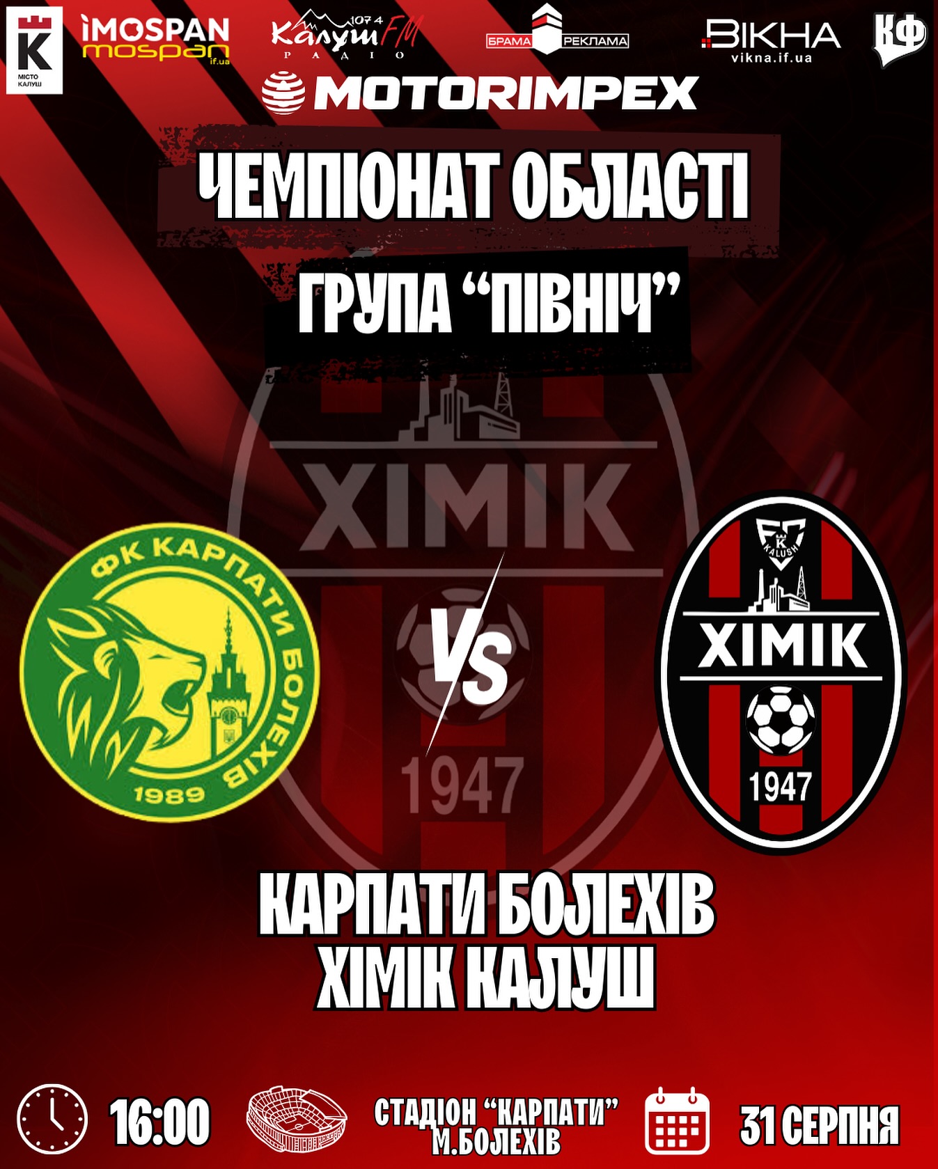 У рамках 3 туру Чемпіонату Івано-Франківщини з футболу у групі “Північ” футболісти калуського “Хіміка” відправиться до Болехова на матч проти “Карпат”. Матч розпочнеться о 16:00.