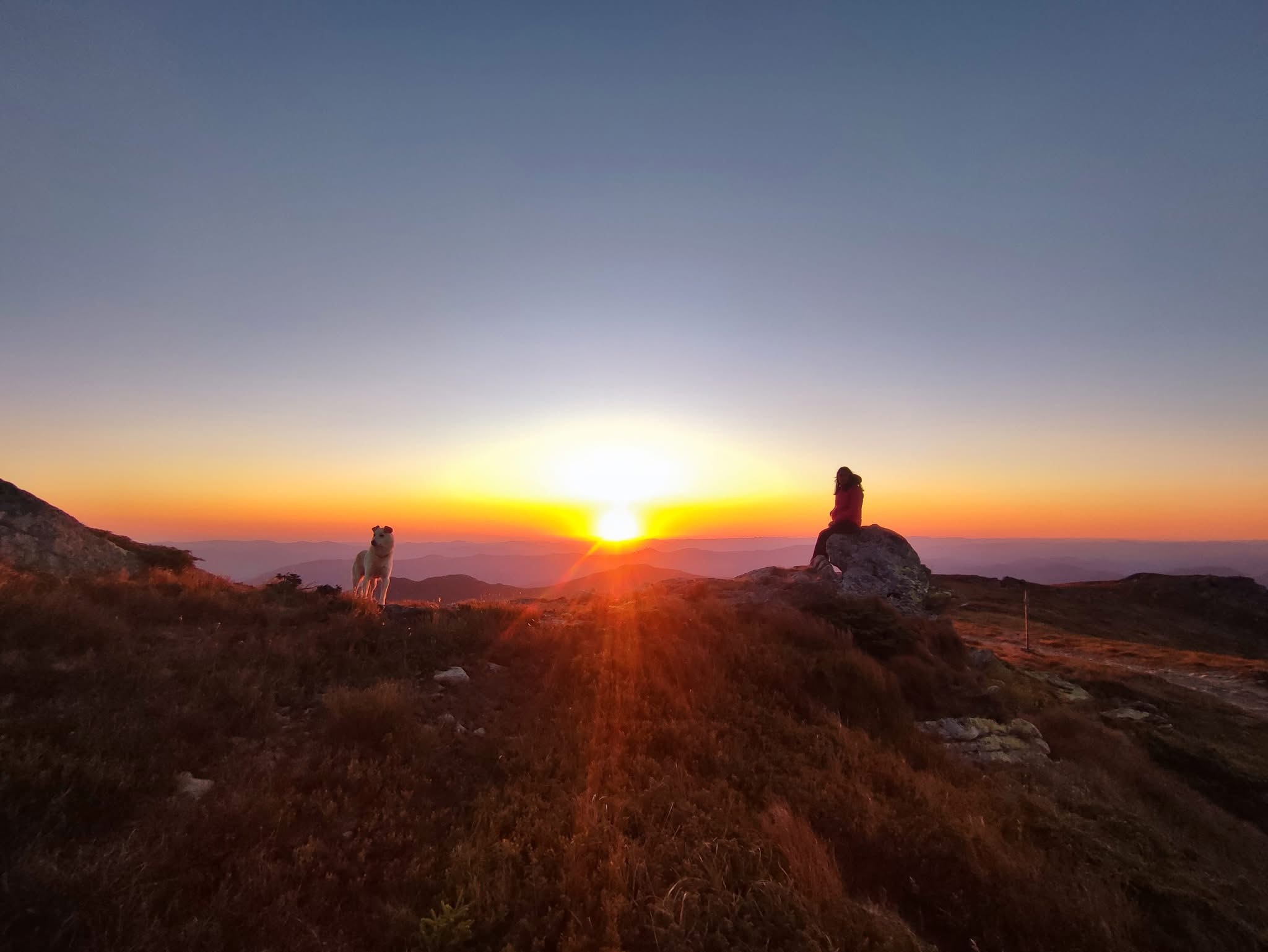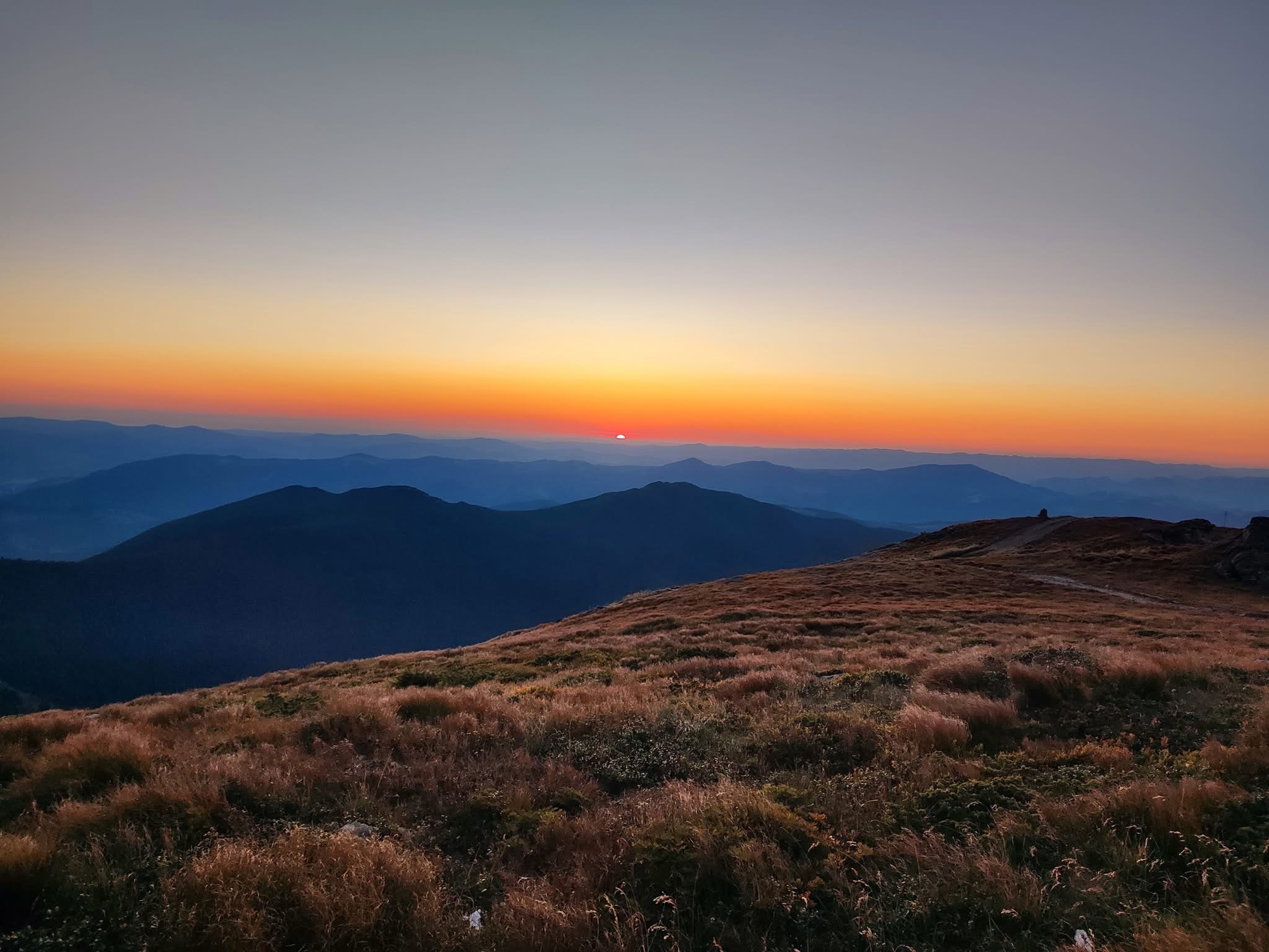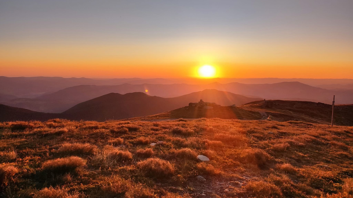 Над хребтами поступово розгорається світанок — сонце виривається крізь хмари й підсвічує вершини рожево-золотим світлом.