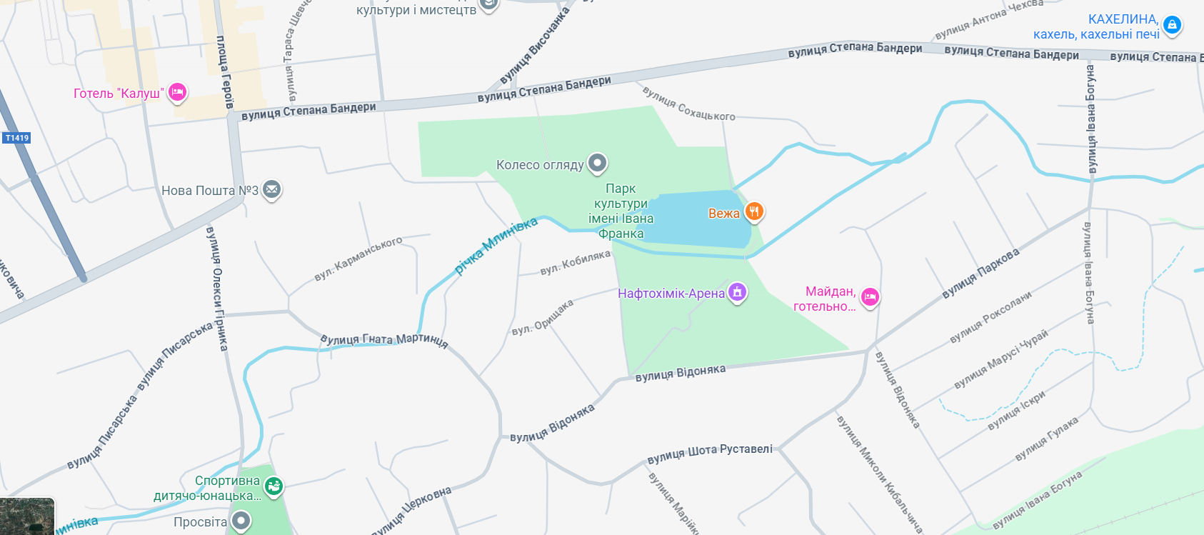 Заїзд на вулицю Паркову — через вулицю Івана Богуна (якщо їхати з Підгірок у Калуш, то це вище “Кахелини”). Далі — вулиці Відоняка та Гната Мартинця (можна також вулицею Церковною) виведуть водія на вулицю Олекси Гірника та підйом на вулицю Грушевського.