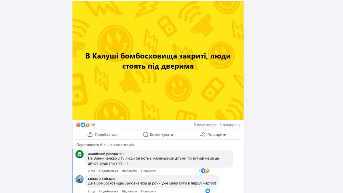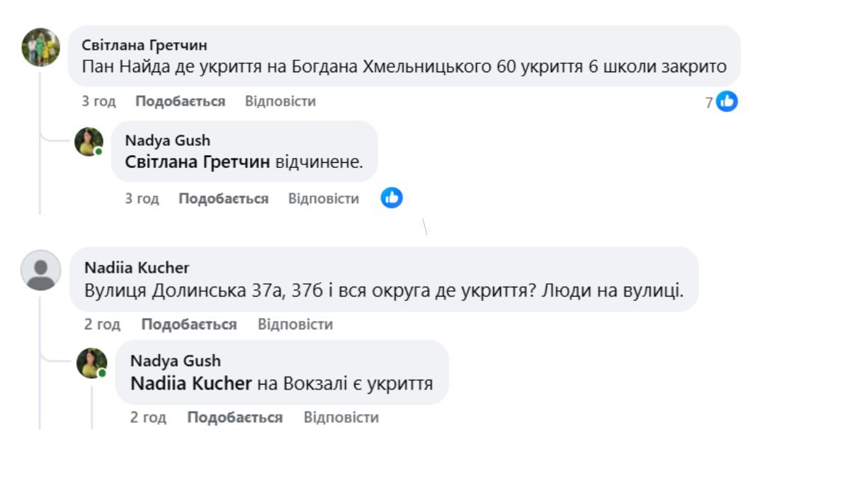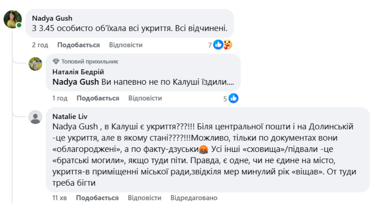 У коментарях у соцмережах на звернення калушан реагувала заступниця міського голови Надія Гуш. Вона відповідала на запитання мешканців і доповідала, про відкриті та доступні укриття міста.