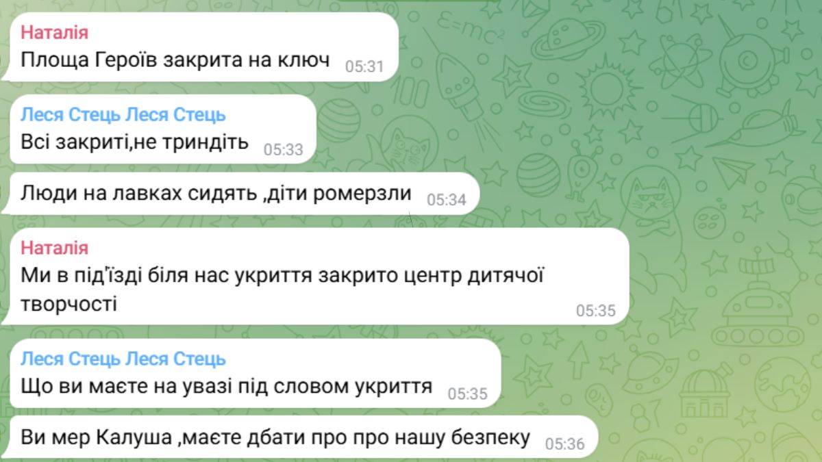 Нічна тривога у Калуші викликала не лише страх через вибухи, а й обурення мешканців: частина людей заявила, що не змогла потрапити до укриттів.