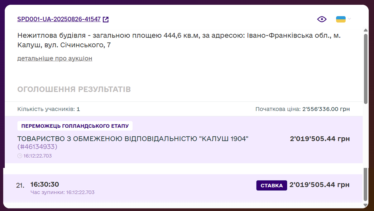 Акціон пройшов 3 вересня 2025 року. На нього з’явився єдиний учасник — ТОВ “КАЛУШ1904”, який за результатами й став переможцем. Стартова ціна будівлі на вул. Січинського, 7 становила 2 556 336.00 грн. Натомість торги провели за голандською системою — система автоматично покроково знижує стартову ціну лоту з високої до нижчої, допоки один із учасників не натисне кнопку “Зробити ставку”.
