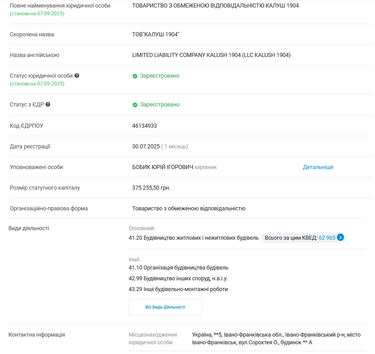 Фірма-переможець “КАЛУШ1904” згідно із YouControl зареєстрована 30 липня 2025 року у м. Івано-Франківську за адресою: вул. О. Сорохтея. Тож їй трохи більше 1 місяця. Уповноваженою особою зазначено Юрія Бобика. Відповідно основним КВЕДом зазначено 41.20 Будівництво житлових і нежитлових будівель.