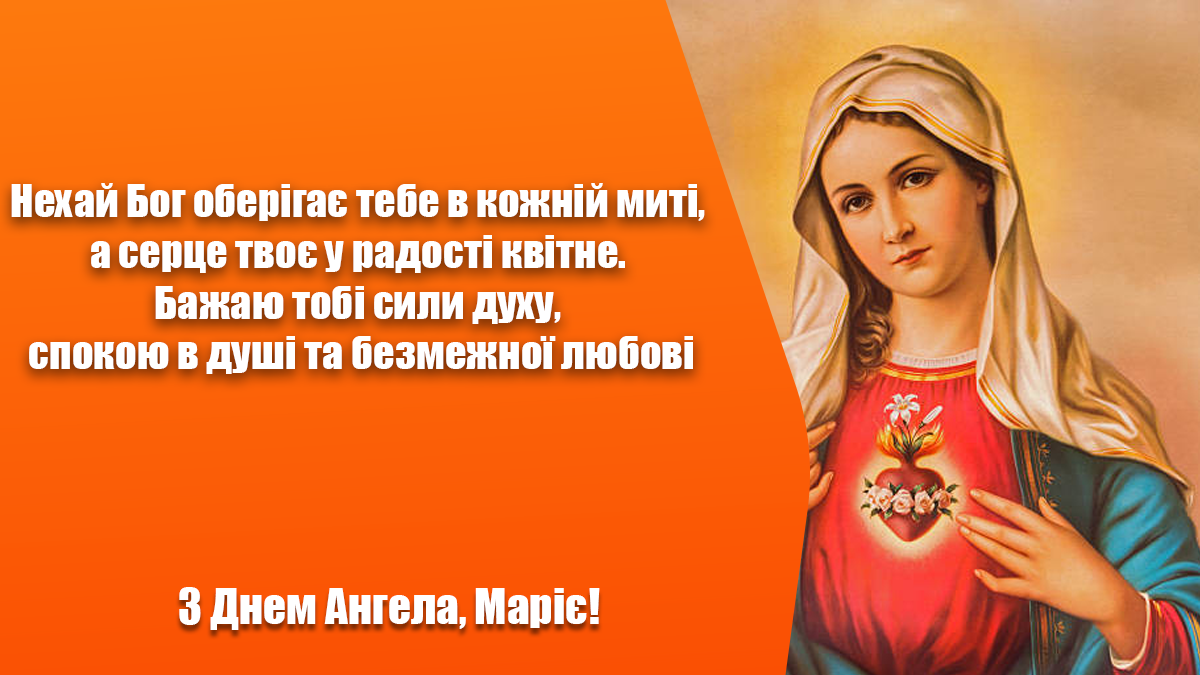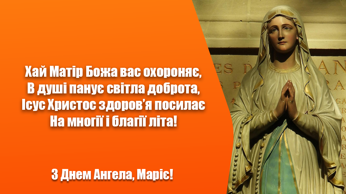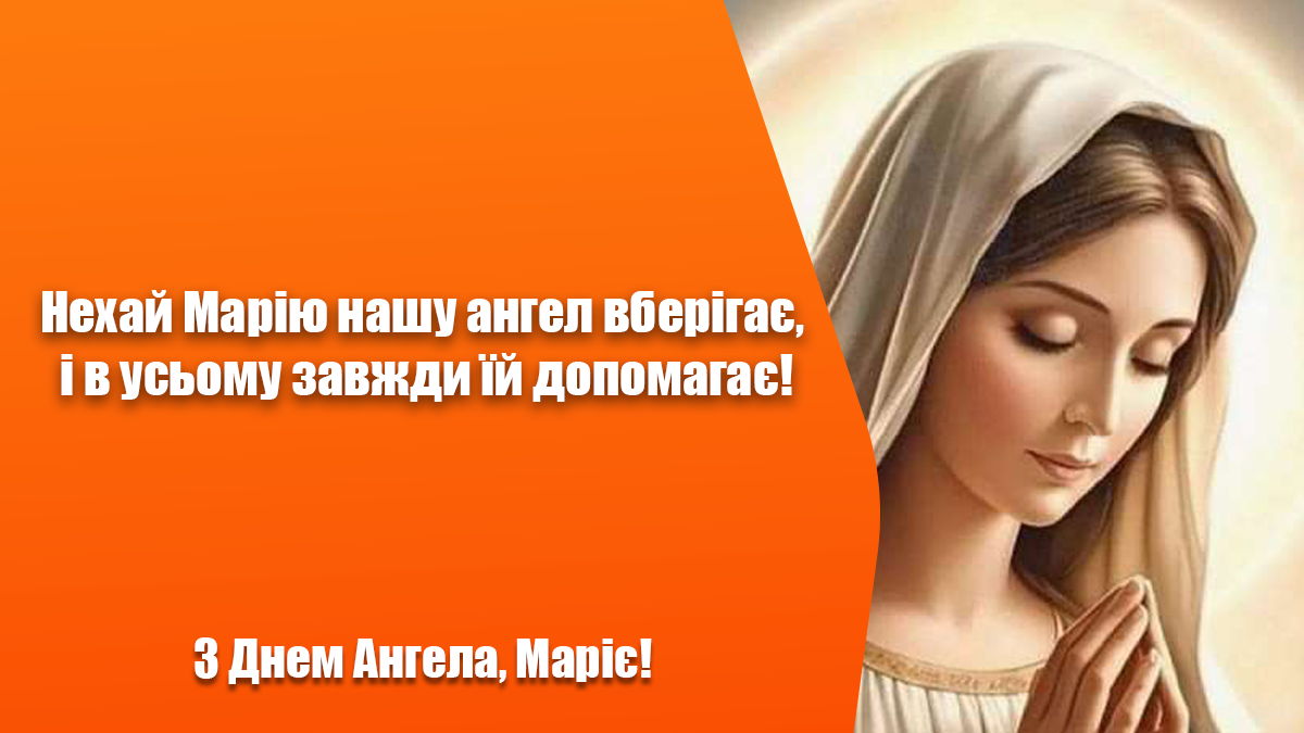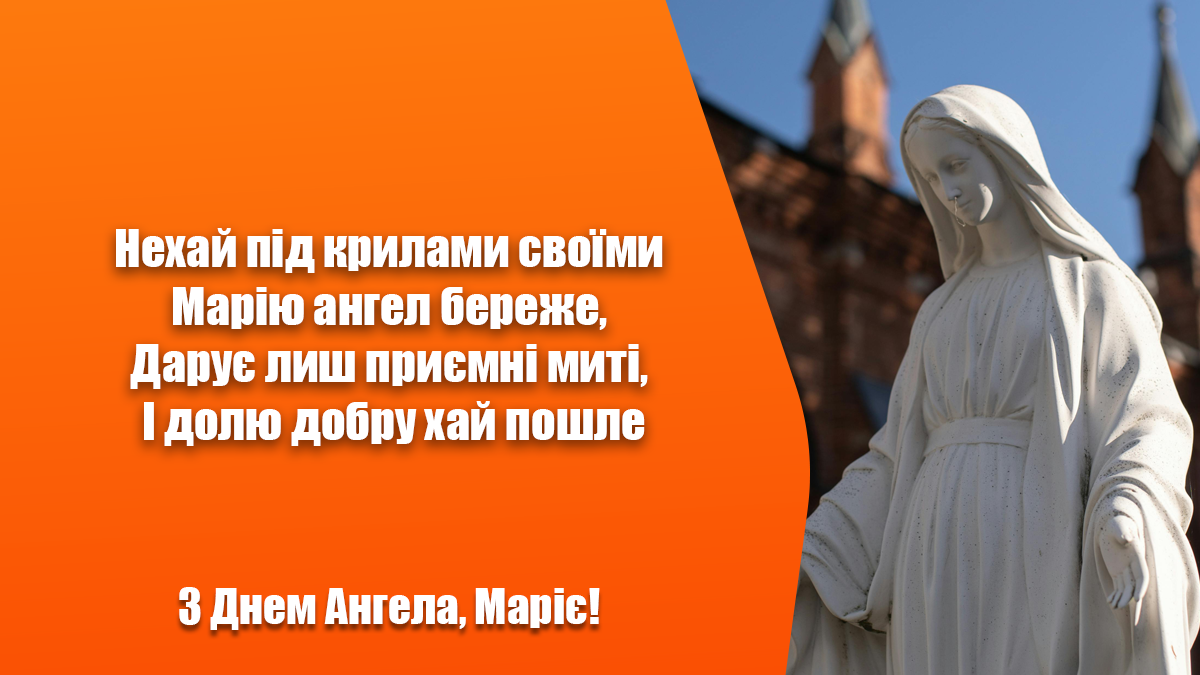 З Днем ангела, Маріє! Нехай цей день принесе тобі безмежну радість і усмішку. Бажаю, щоб кожен день твого життя був наповнений теплом і щастям. Нехай всі твої мрії збуваються, а ангел-охоронець завжди оберігає і підтримує тебе на кожному кроці.