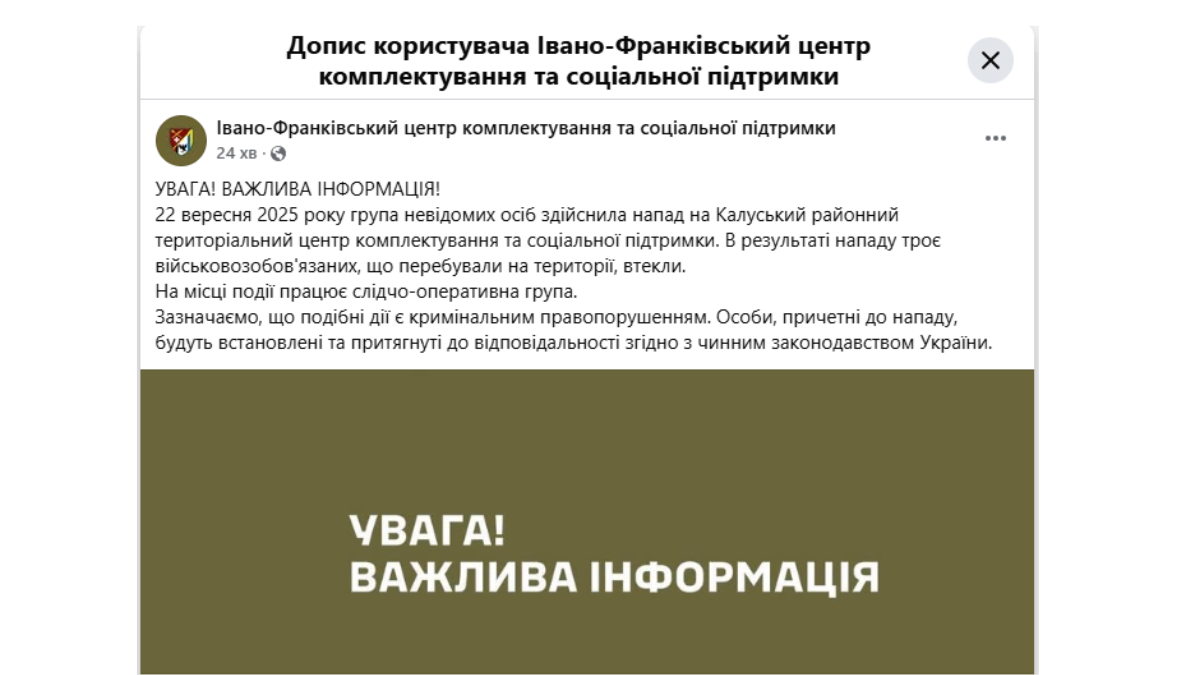 “22 вересня близько 18:30 до поліції надійшло повідомлення про те, що група невідомих розбила вікна та двері Калуського районного територіального центру комплектування та соціальної підтримки.