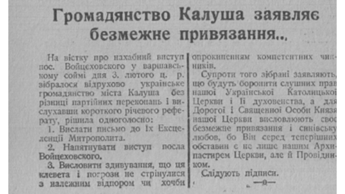“На вістку про нахабний виступ пос. Войцеховского у варшавському соймі дня 3. лютого ц. р. зібралося відрухово українське громадянство міста Калуша без різниці партійних переконань і вислухавши короткого річевого реферату, рішила одноголосно: