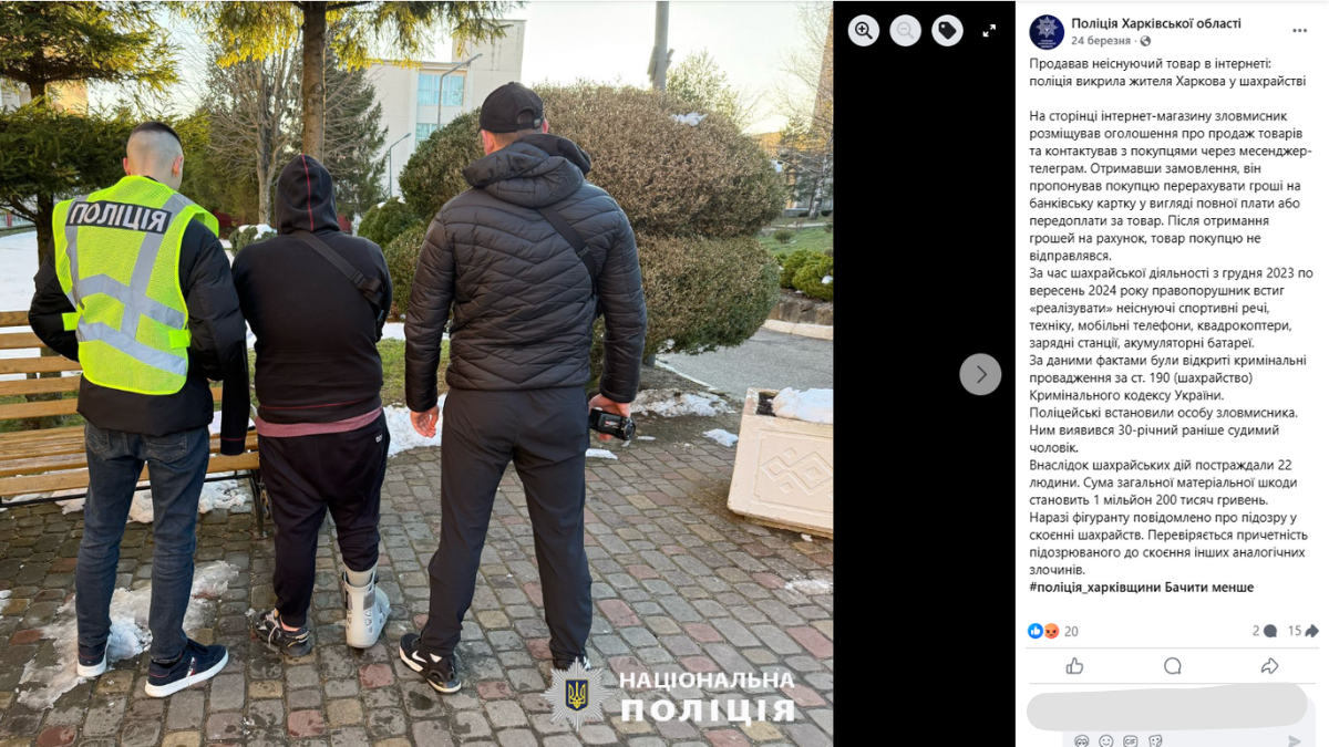 Так, навесні 2025 року поліція Харківської області повідомляла про затримання чоловіка, який продавав неіснуючий товар в інтернеті. Йшлося, про 22 постраждалих та суму загальної матеріальної шкоди у розмірі 1 мільйон 200 тисяч гривень. Період діяльності — з грудня 2023 по вересень 2024 року. За цей час, за даними поліції, правопорушник встиг “реалізувати” неіснуючі спортивні речі, техніку, мобільні телефони, квадрокоптери, зарядні станції, акумуляторні батареї. За даними фактами були відкриті кримінальні провадження за ст. 190 (шахрайство) Кримінального кодексу України.