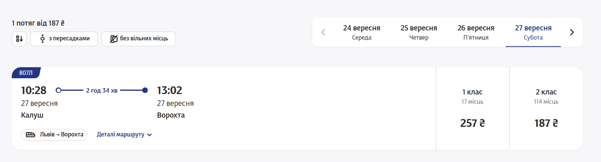 На сайті Укрзалізниці вже можна придбати квитки із Калуша до Ворохти на суботу, 27 вересня. Їх вартість сягає: