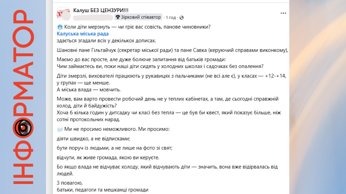 “Коли діти мерзнуть — чи гріє вас совість, панове чиновники?” — йдеться в одному з нинішніх дописів у соцмережі Facebook.