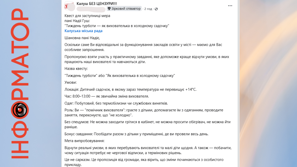 В іншому дописі заступниці міського голови, яка курує питання освіти Надії Гуш, пропонують “взяти участь у практичному завданні, яке допоможе краще відчути умови, в яких працюють наші вихователі та навчаються діти”.