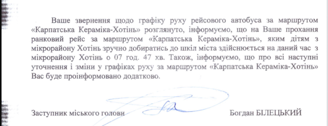 “… Інформуємо, що на Ваше прохання ранковий рейс за маршрутом “Карпатська кераміка — Хотінь”, яким дітям х мікрорайону “Хотінь” зручно добиратися до шкіл міста, здійснюється на даний час з мікрорайону о 07 год 47 хв. Також інформуємо, що про всі наступні уточнення і зміни у графіках руху за маршрутом Вас буде проінформовано додатково”.